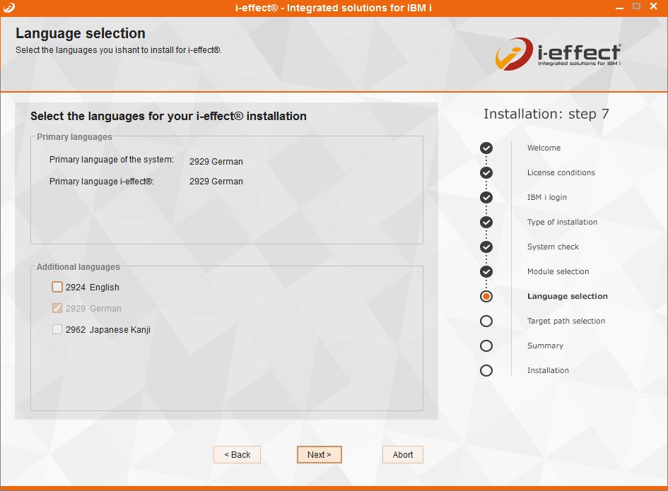 Because the primary language of the system, which will be automatically selected as the primary language for i-effect, cannot be installed as a secondary language, this language is disabled in the selection.