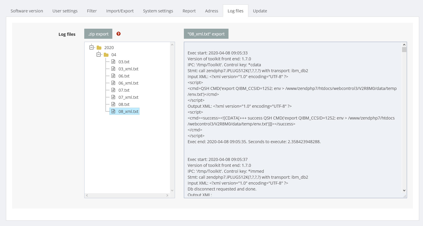All available log data are listed here sorted by date. Both the normal log files and logs of the XML toolkit, which are in a separate file with the suffix _xml, are displayed. The logs can be exported via the buttons individually as a TXT file, or all together with the folder structure as ZIP.