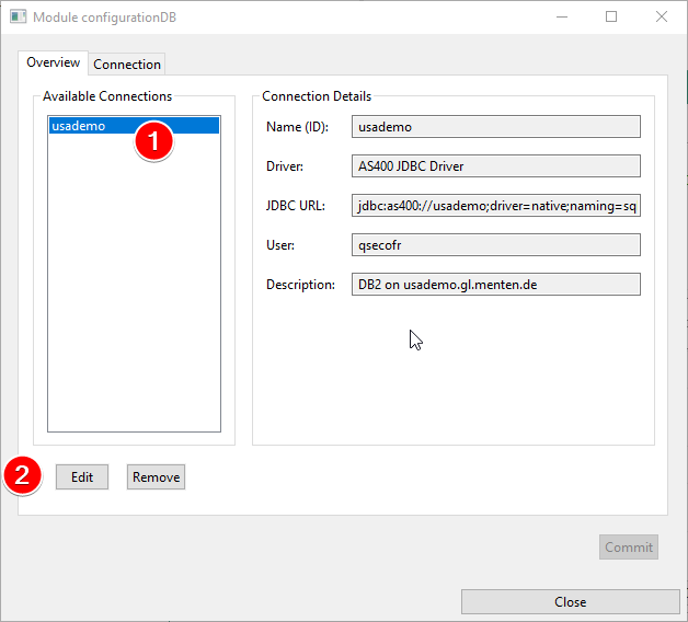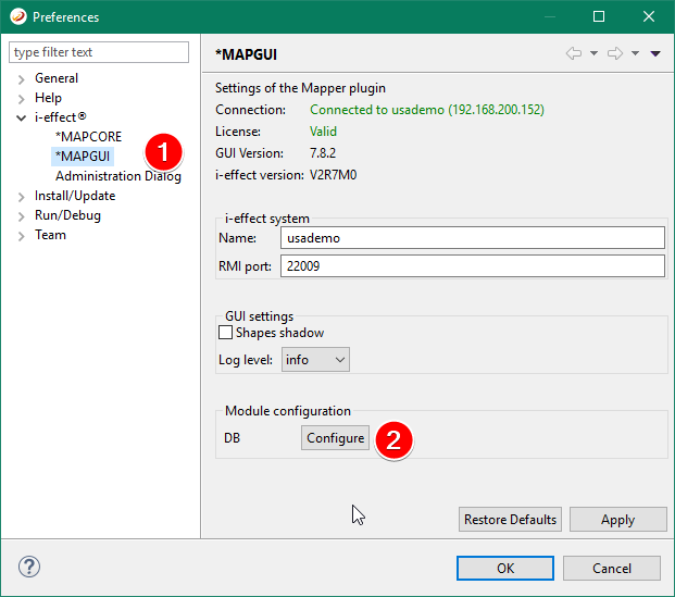 Select *MAPGUI in the left navigation bar (1) and open the DB settings by clicking on “Configure” (2)
