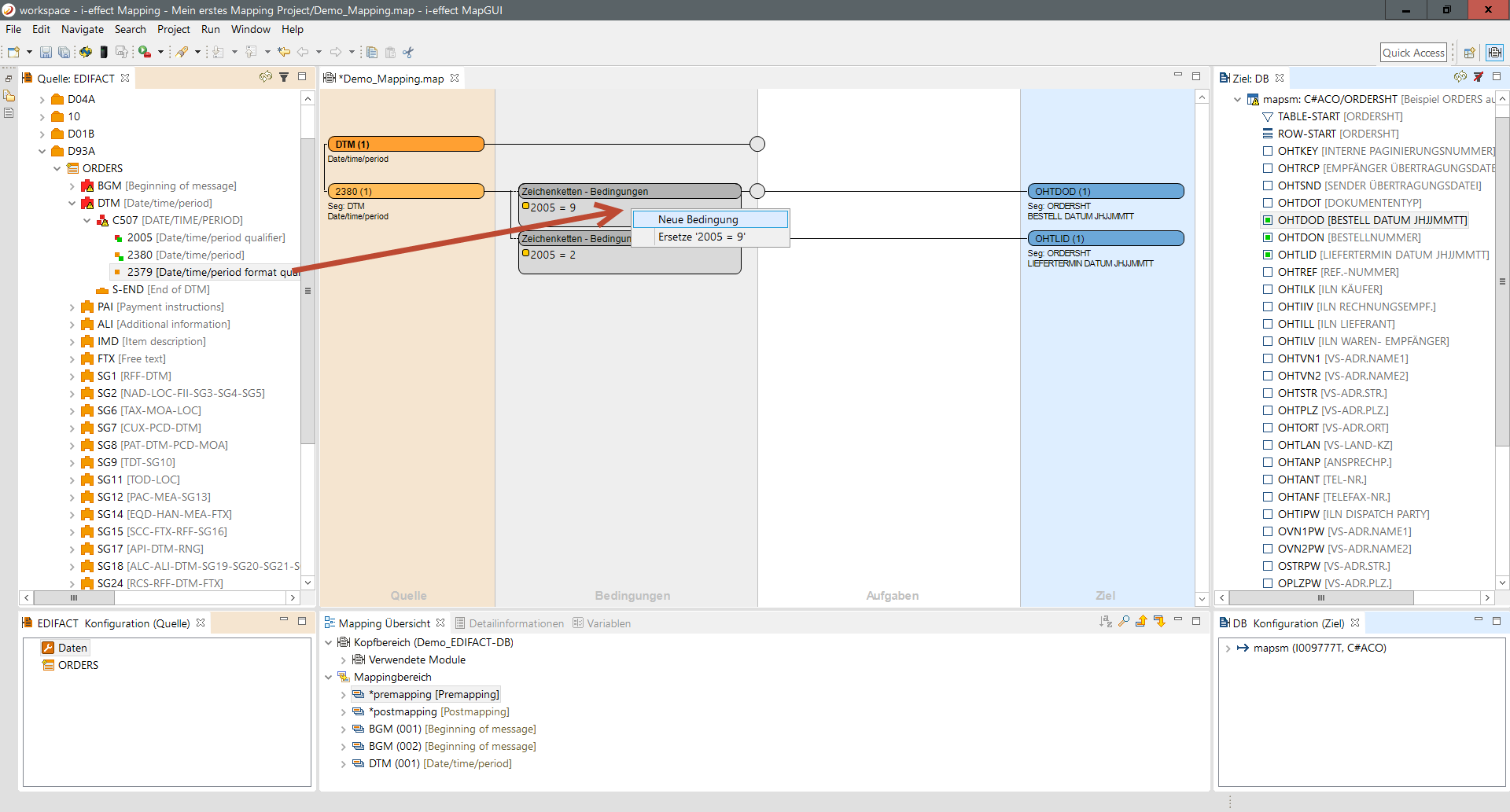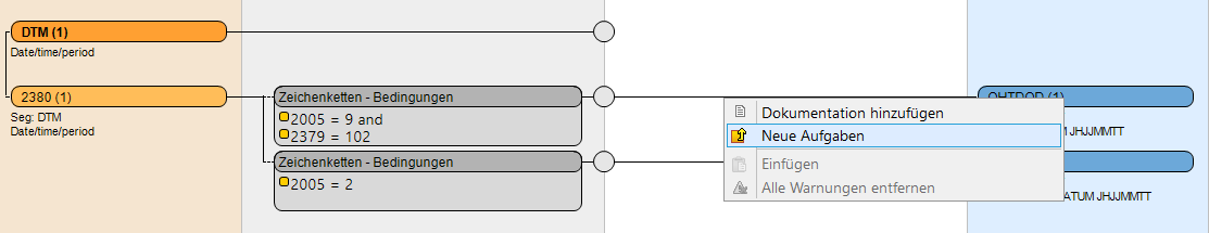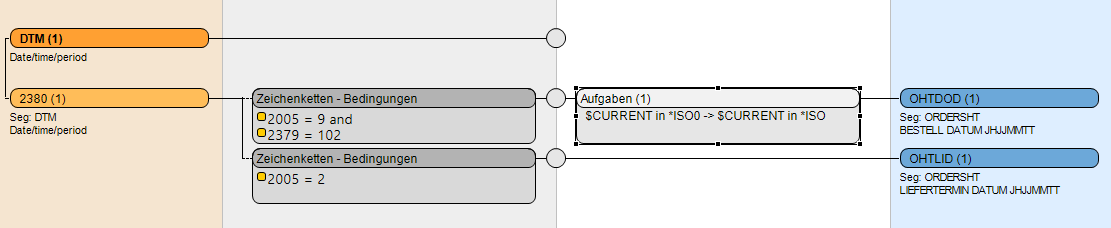 The following combines the conditions test with tasks and it expands the example to mapping of date fields from EDIFATCT DTM to DB. A possible problem could be that the date value of the DTM segment is not in the correct format for the database field. The goal is to convert the incoming value into the correct format before it is written into the target field. The task framework caries this kind and many other kinds of tasks.