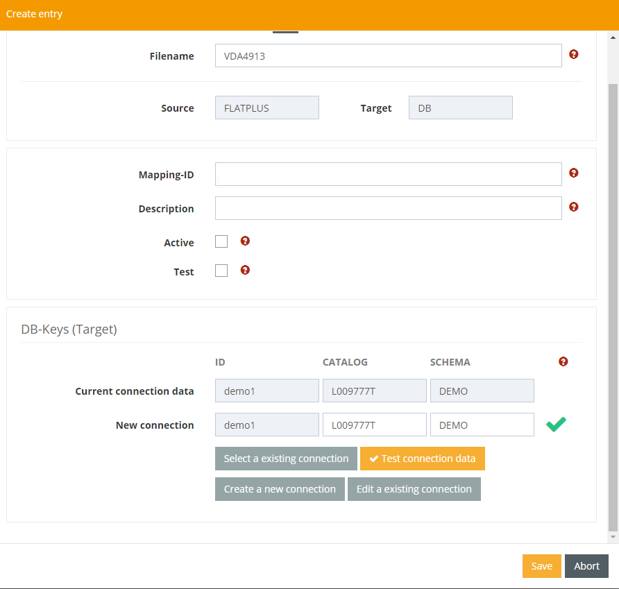 If mappings are to be transferred from one system to another, the import and export functions of this administration support the adjustment of connection ID, database name, schema name as well as (jdbc)SqlLookups and (jdbc)SqlUpdates.