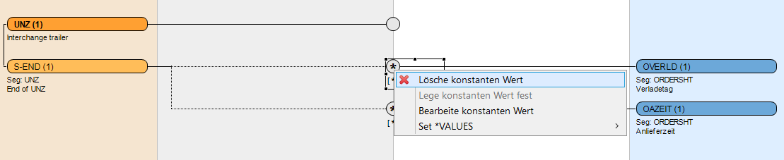 This section explains an additional function of the editor. It is possible to assign constant values a variable's value or special values (*VALUE) to target fields. Constant values are almost required when mapping from DB to EDIFACT, if the point is to give the value of a target field the correct qualifier for it's corresponding qualifier field directly.
