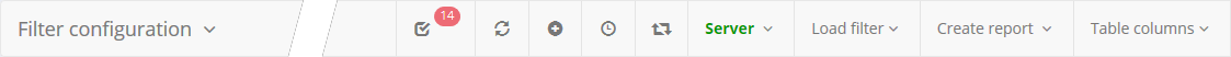 The menu bar can be found at any page with a table view. It is the first item below the control bar. The menu bar consists of different buttons, which either are shown in form of an icon or in form of a text link and as you click on them they either perform an action or open up more menus with settings