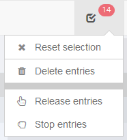 | Menu for multiple selection If there are table entries selected with a checkbox on a page, this icon is displayed. It has a counter with the number of all marked entries, in addition a menu can be opened by clicking on the icon. In this menu the selection can be reset. Depending on the page, there is also the option to delete selected entries or other page-specific options.