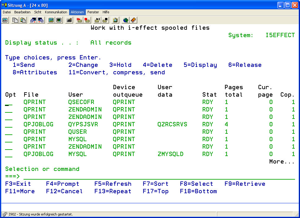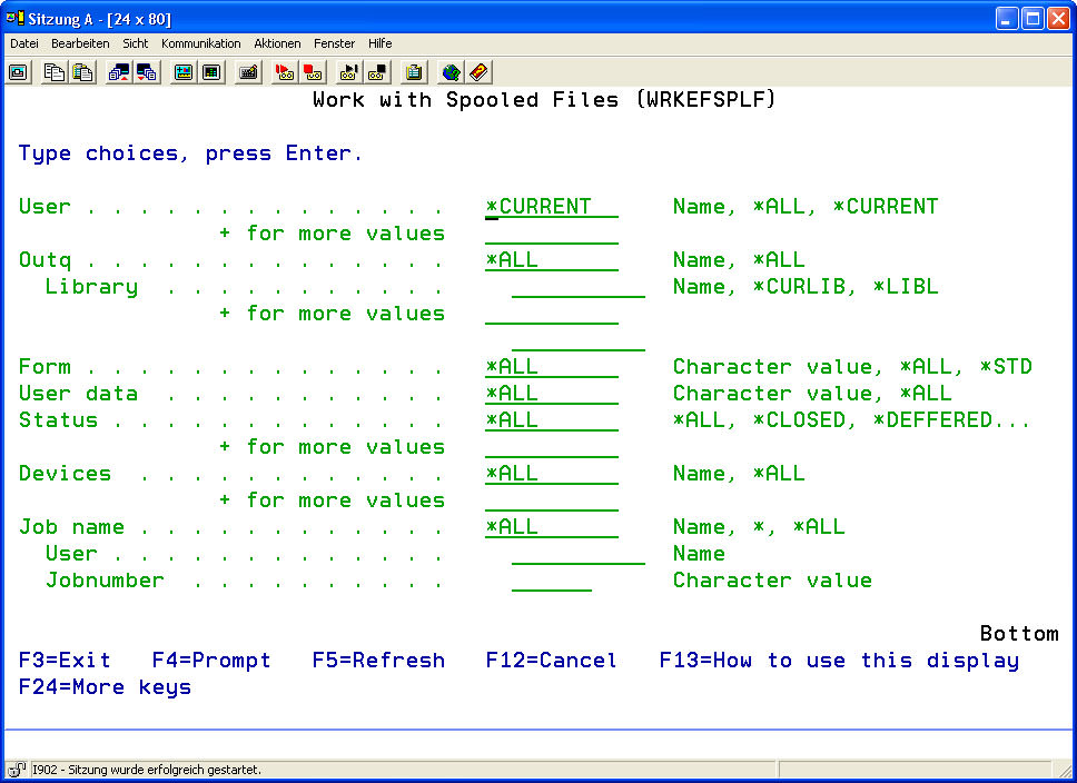 * Uses spooled files only from the current job. *ALL Uses all spooled files on the system. User Enter the name of the spooled file's user. Job Number Enter the name of the job which created the spooled file. After the parameters have been set, the spooled files will be listed. This list contains all attributes and options, such as display or change.