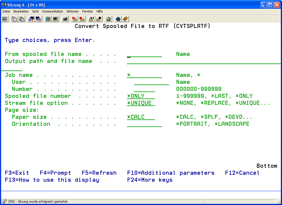 - Choose menu item 12 "Convert Spool into RTF" or enter the command CVTSPLRTF to convert spooled files into RTF files. From the interactive program WRKEFSPLF (Work with i-effect Spooled Files) option 11 can be entered in front of the desired line. In the appearing program interface, enter *RTF next to conversion, under conversion configuration.