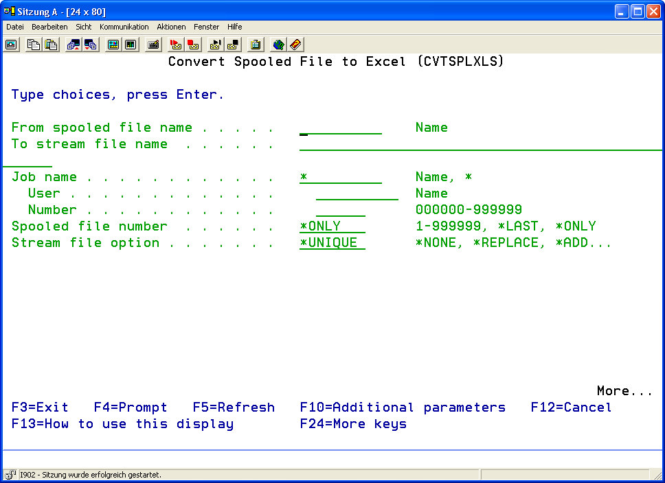 | | Column separator character | If the parameter COLUMN OTP (* TOKEN) is specified, the data from the spool file will be divided according to this value to the Excel columns. The default value is * SPLF, and states that are divided according to the structure of the spool file into Excel columns values. If the spool file was created by an external described printer file, this value provides probably the best result since the data is sorted in the spool file so that any logical or natural element is converted into a Sepearates identifiable element. However, if the spool file Outlined by an internal printer file or an application, have been as Query created / 400, so the data is in a single logical block are summarized. In this case, it is better to provide a value andem the data can be separated. | *SPLF | The separator is to be recognized and used based on the printer file. | | *BLANK | Equivalent to a blank |