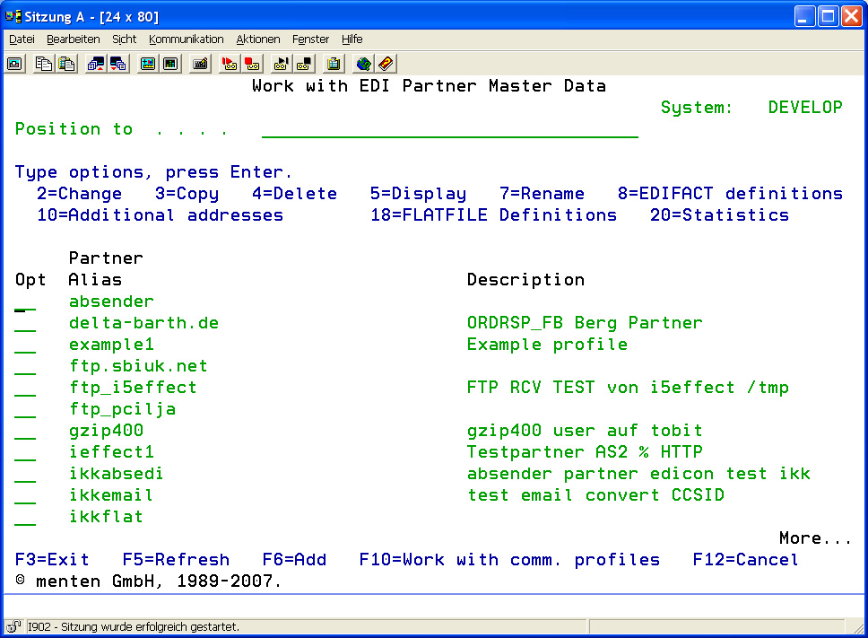 | Add (option F6) | Use option F6 (function key F6) to add a new partner. In the appearing program interface, choose an alias name for the partner. Then, further data required for communication with this partner can be entered. |