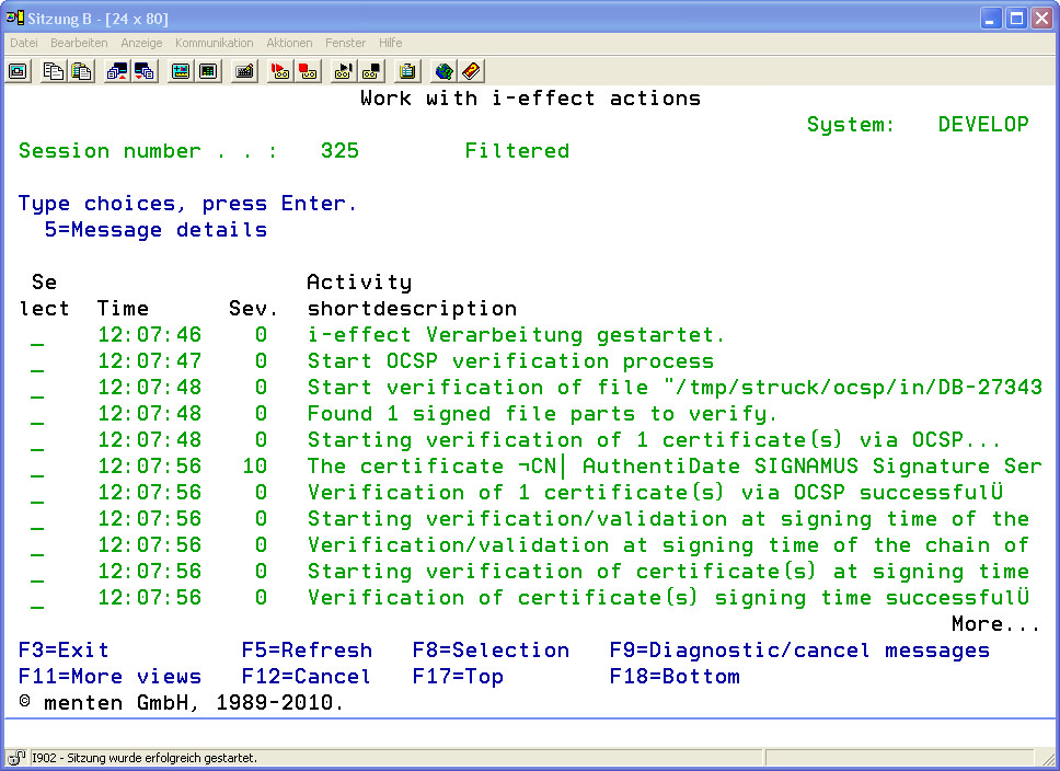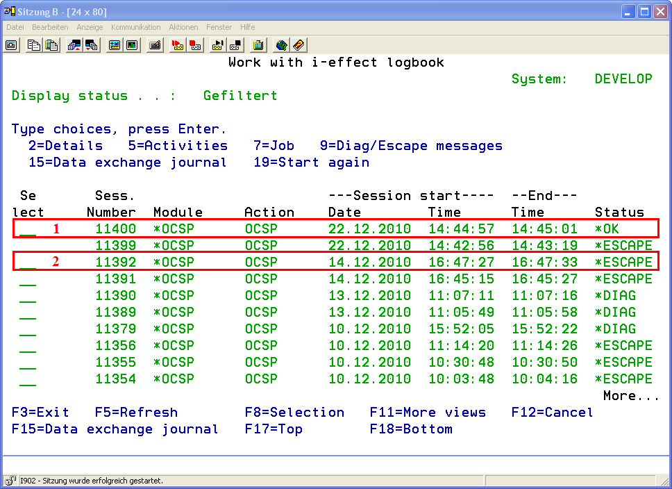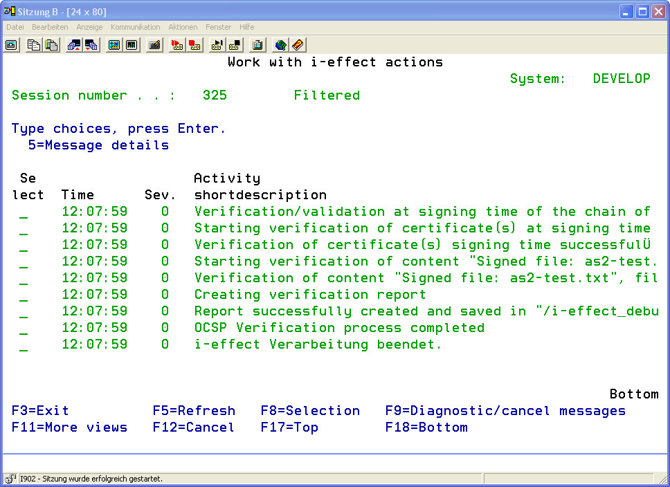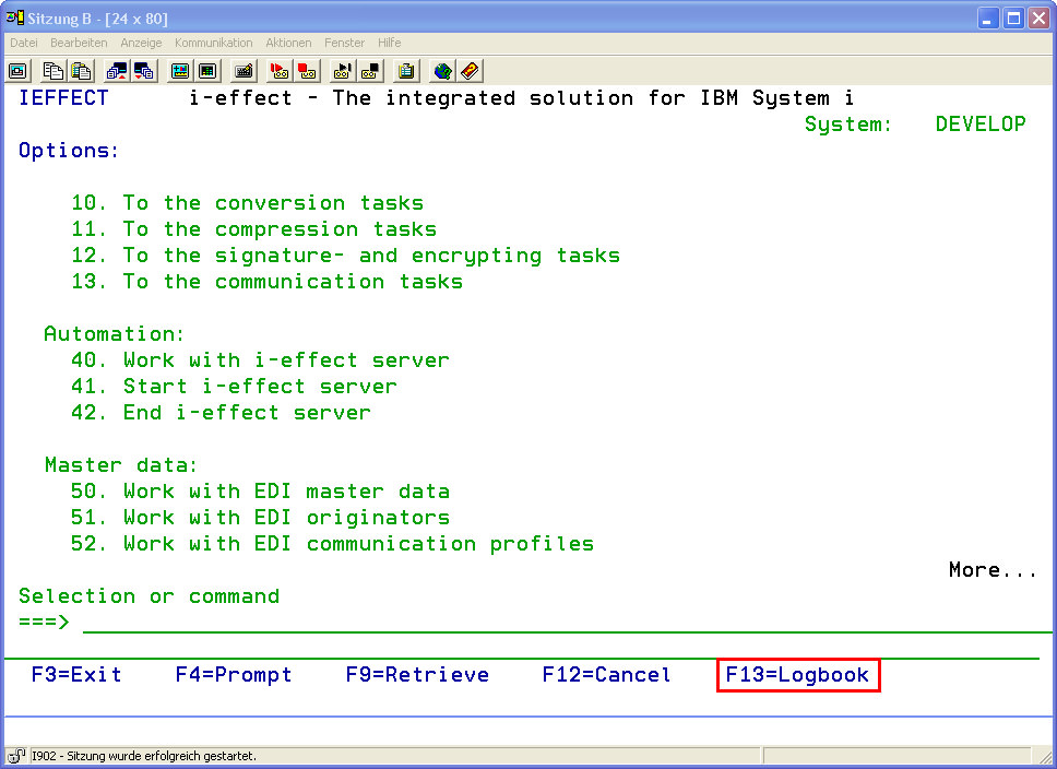 The individuals processing steps of commands in use can be recorded and followed in the i-effect Logbook. Every registered command (or a command chain using *SERVER) has its own session number under which all logging entries are saved within the logbook.