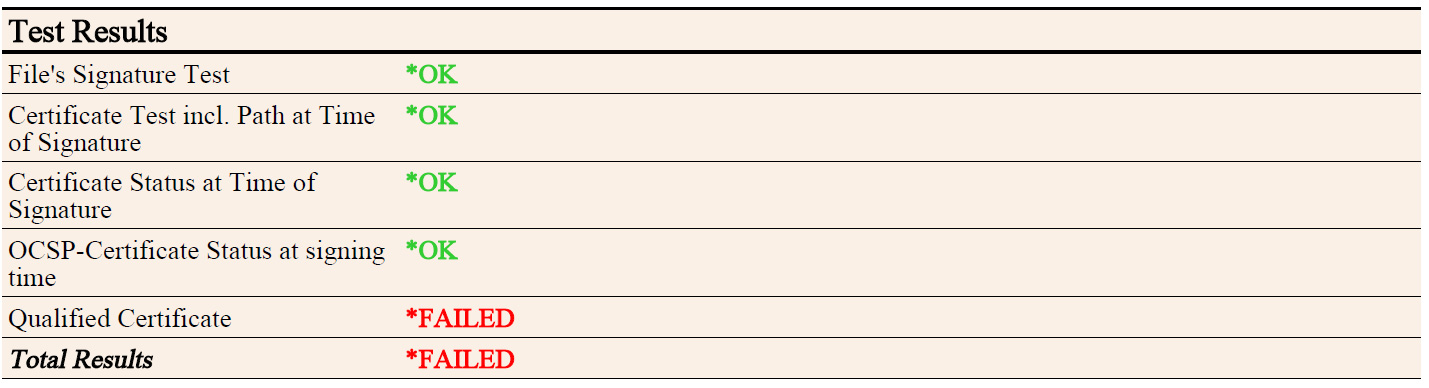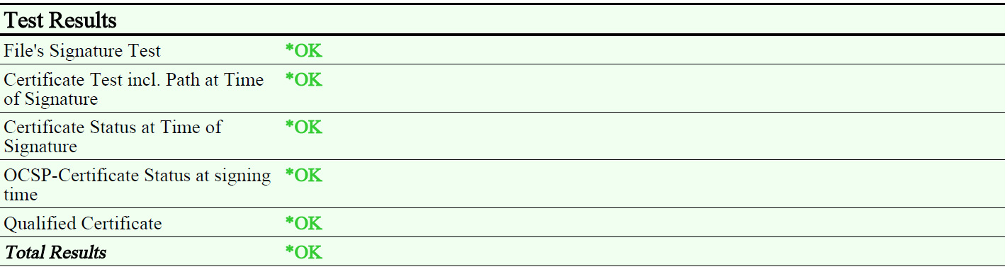 The report of a successful verification lists the details in the area called "Test Results" of the results of the individual processing steps: