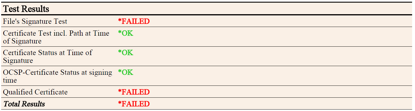 In this example of a failed test, the verification of the signed data shows a manipulation of the original document.