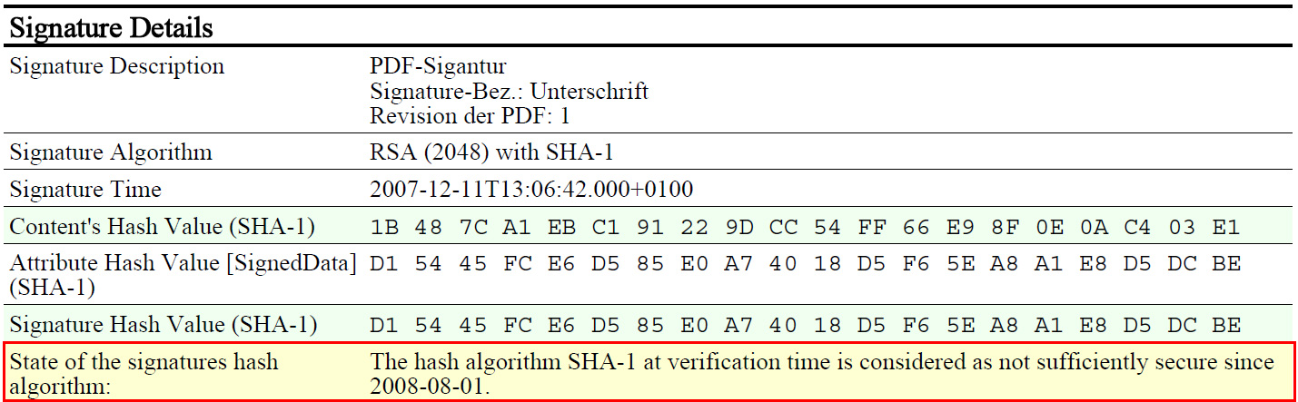 *DIAGNOSE generally means that verification was successfully completed. However, verification indicated, that either the hash-algorithm or the RSA key length (or both) are (were) no longer adequately secure at the time of verification (more information can be found at the German Federal Network Agency's website).