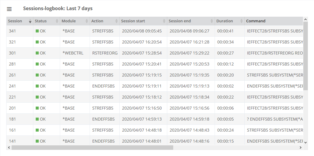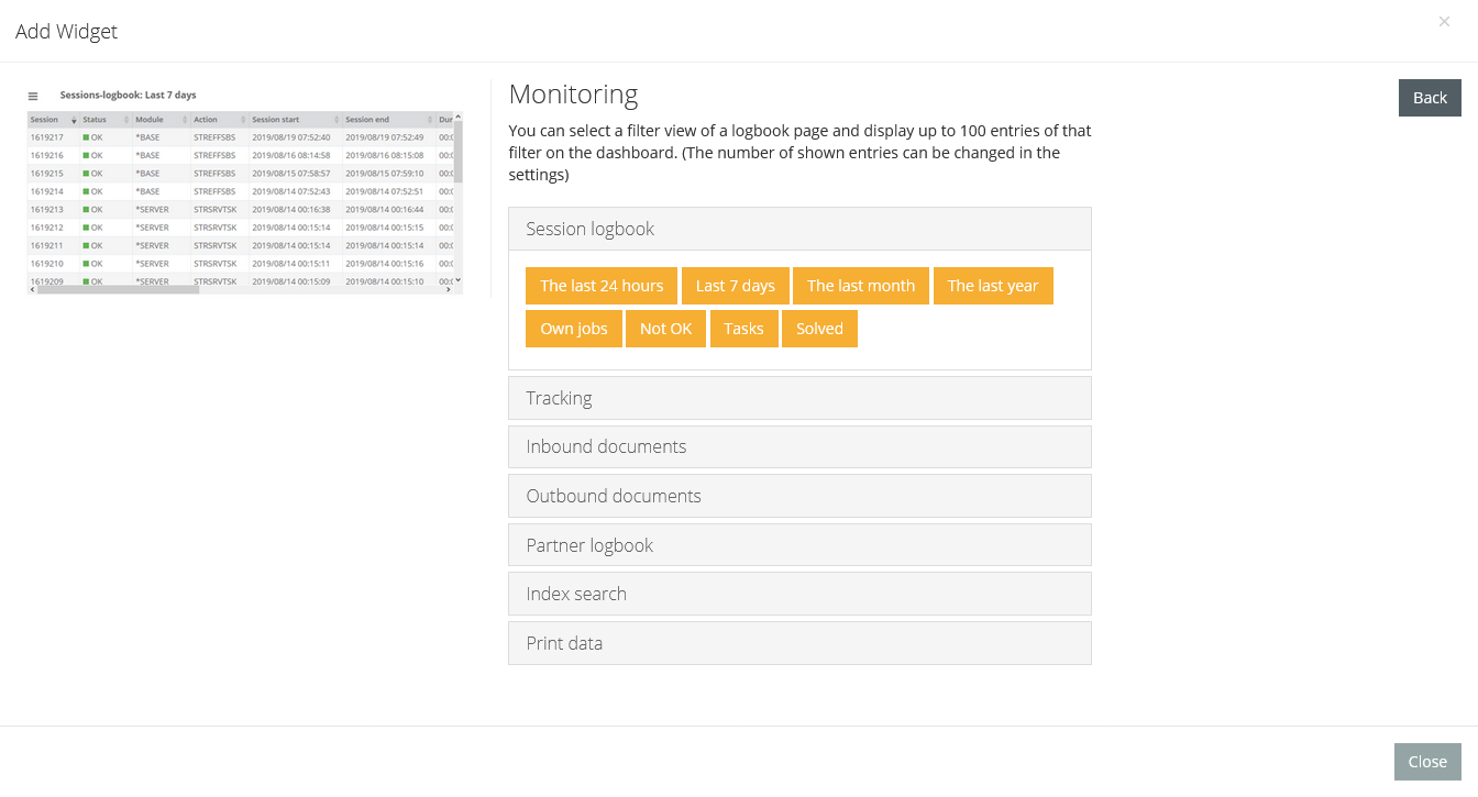 Since i-effect 2.7, tables from the Monitoring section can be displayed on the dashboard. For this purpose, a filter view of a logbook page is selected and displayed on the dashboard with up to 100 filter entries. . The predefined system filters as well as the filters saved by each user for himself are available for selection.