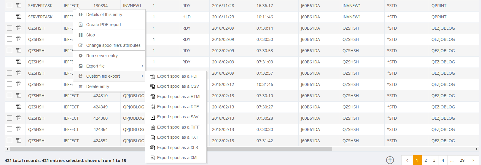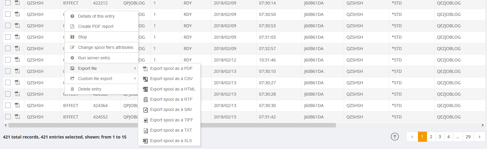The page Print editions shows all existing spool-entries. As a standard view for this page a defined system filter IEFFECT is loaded, which only shows spool-entries of the i-effect®software (user IEFFECT). If a filter is selected, you can see it on the one hand by the dark red font of the filter settings and on the other hand by the fact that in the upper right corner a red filter Filter: User IEFFECT is shown.