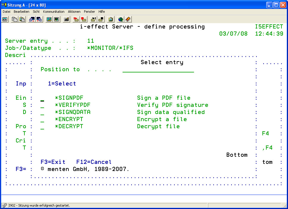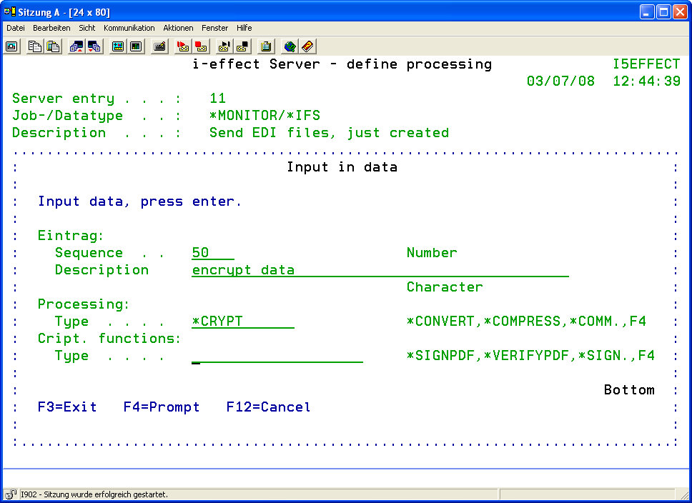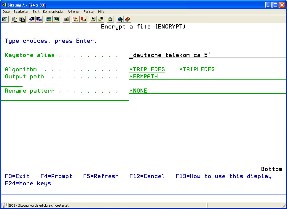Press function key F4 to determine the cryptographic functions: