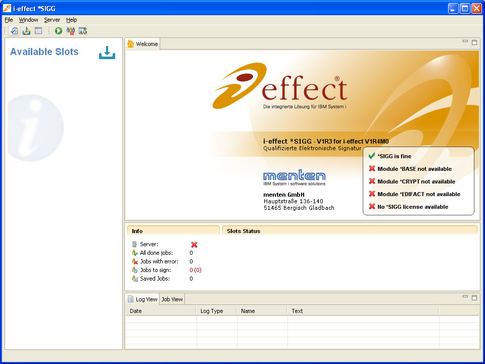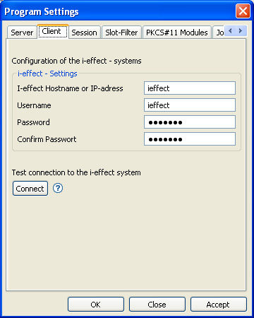 The settings in this tab serve the signature server to access the i-effect - IBM Power Systems n order to allow license queries, to realize that the processing of jobs can be followed via the i-effect logbook, and to continue the processing of jobs which were aborted or interrupted.