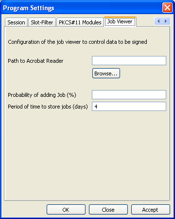 | Probability of Acceptance (%) | Jobs which are sent to i-effect *SIGG are placed in the job viewer with their appointed probability. The German signature law requires that, before signing starts, a job overview is listed in oder to check the data to be signed. This makes sure that corrupted or manipulated data can be detected. Choose a values between 5% and 100% |
