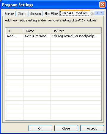 The tab "PKCS#11 Module" serves to manage the PKCS#11 Libraries. This tab allows to access the card reader, and therefore the inserted smart cards.