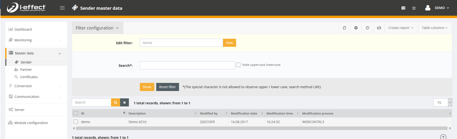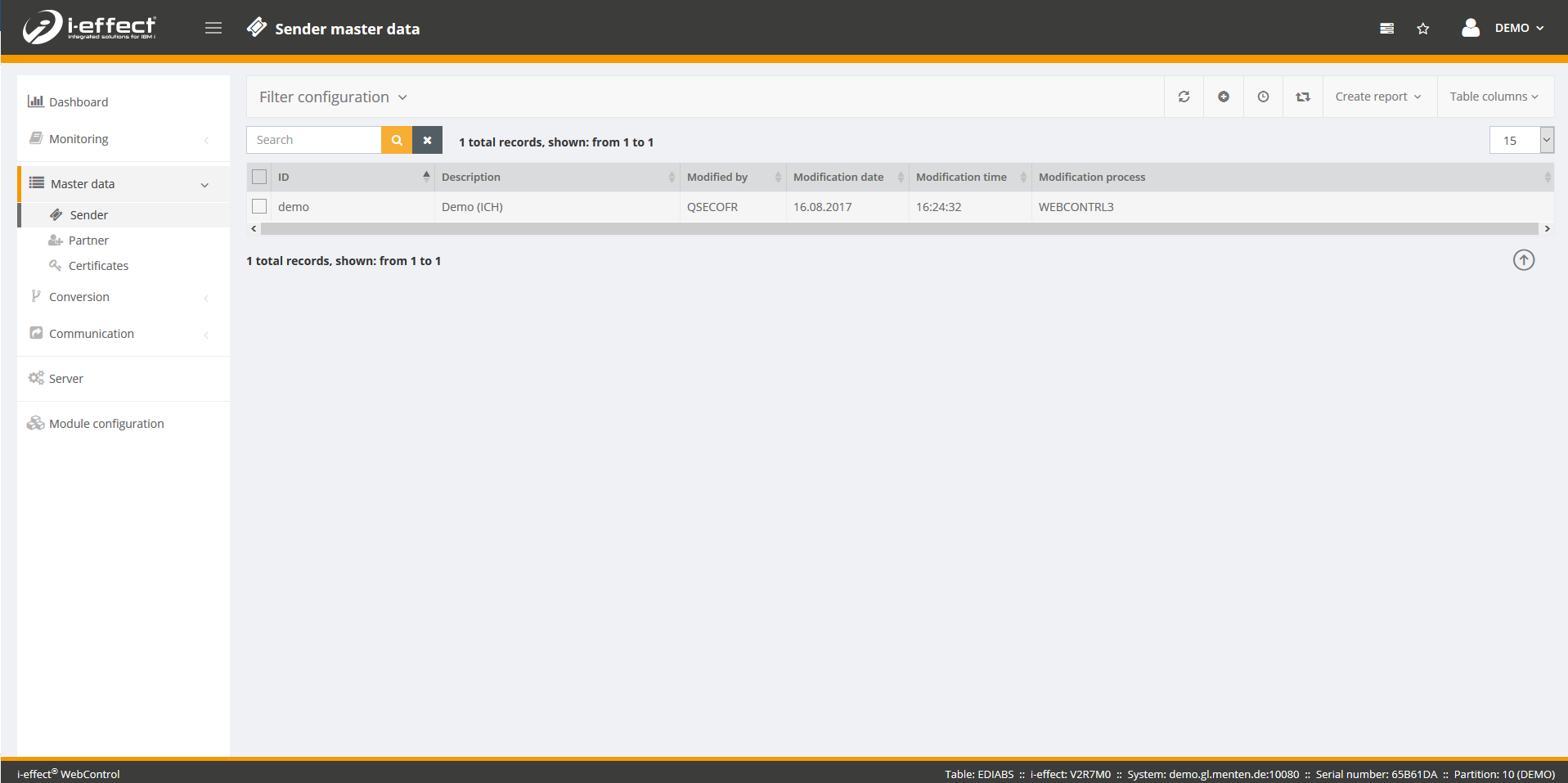 Here the senders are generated and edited. The editing dialog is split into columns, which clearly assign the settings to the modules.