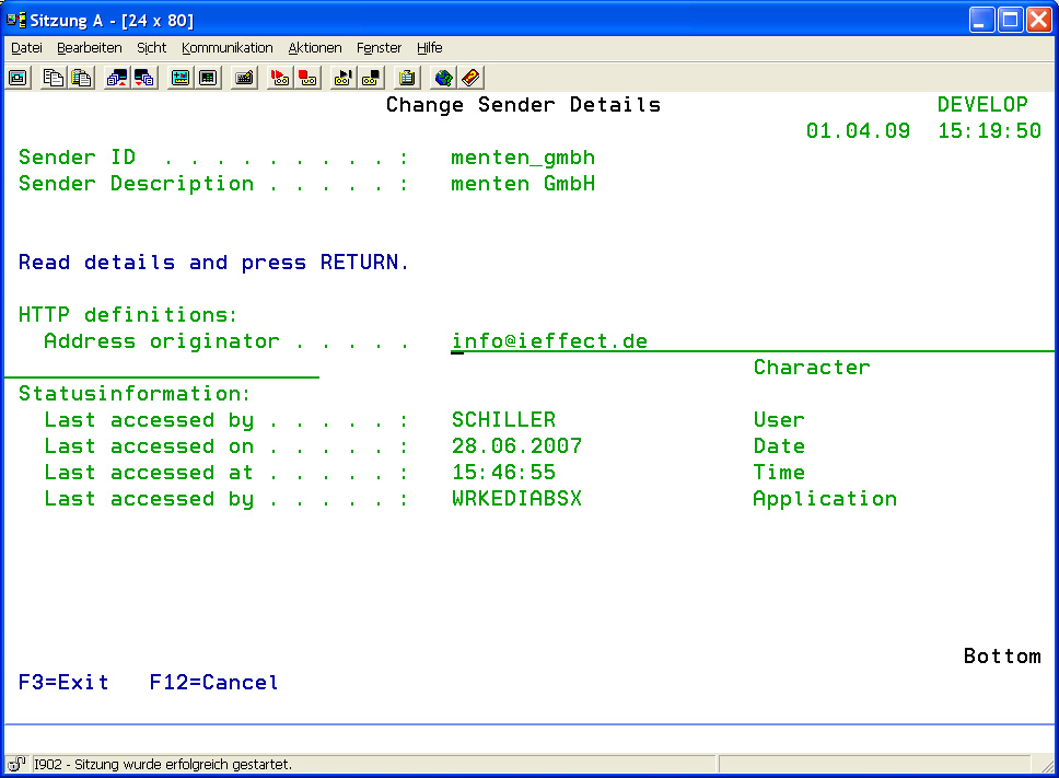 To reach the menu where an HTTP sender partner can be added, select menu item 51 in the i-effect main menu. A list of existing sender partner entries will appear. Press F6 to call up the menu where a new sender partner can be added. Enter a unique ID/name and a description for the sender partner. Press enter and the new entry appears on the list. To change the entry, use option 2 in the corresponding choice box and scroll down to HTTP definitions.