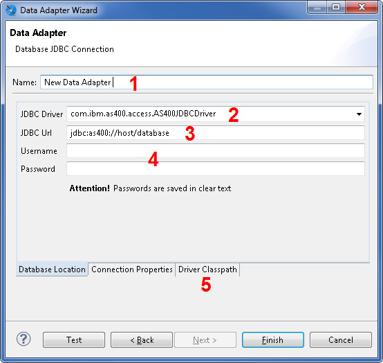 - Change to "Driver Classpath" tab. Enter here, where the file "jt400.jar" is located. In this file, the DB2 driver for Java is located. Click on "Finish" to complete the creation of the Data Adapter.