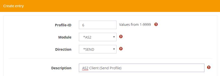 Select *AS2 as the module type and *SEND as the direction. Also assign a profile ID (a number to which you want to assign this profile).