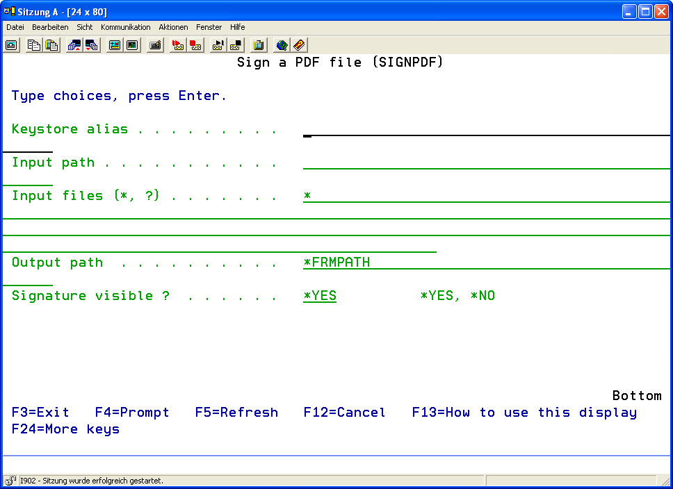 | Input Path (FRMPATH) | Enter the path in the IFS file system from which the PDF files will be taken for the creation of a digital signature. | ||||