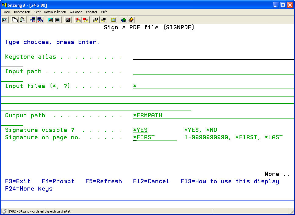 The possible parameters for signing PDF files take up two pages. Press F9 in order to display all possible parameters. To switch between the menu pages use the page up and page down keys.
