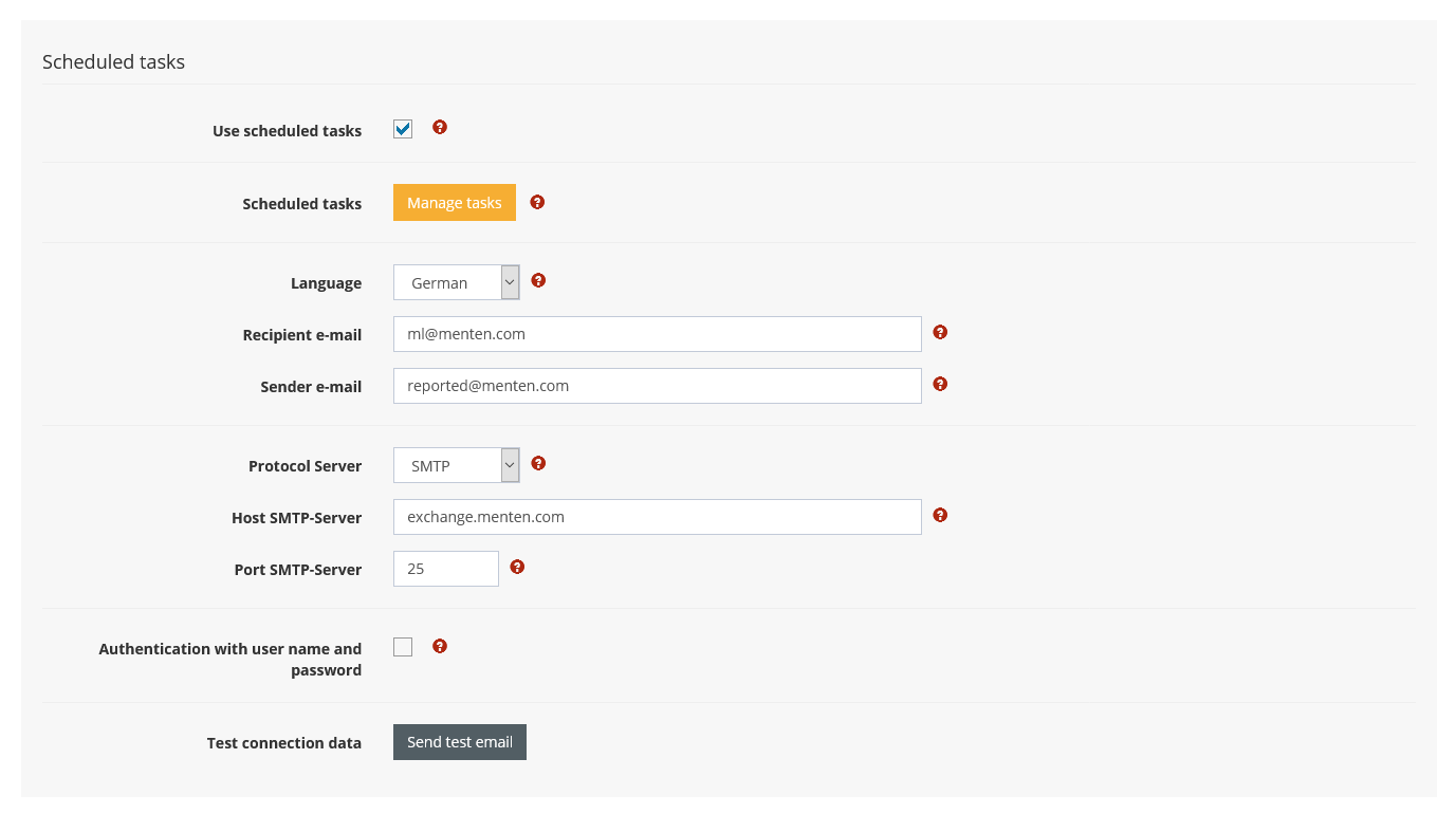 In order to use the notification function, it must be activated by selecting "Use Scheduled Tasks". You must then enter a valid e-mail server and e-mail addresses for the automatic sending of notifications. Only after saving these settings can the tasks be created and edited using the "Manage Tasks" button.