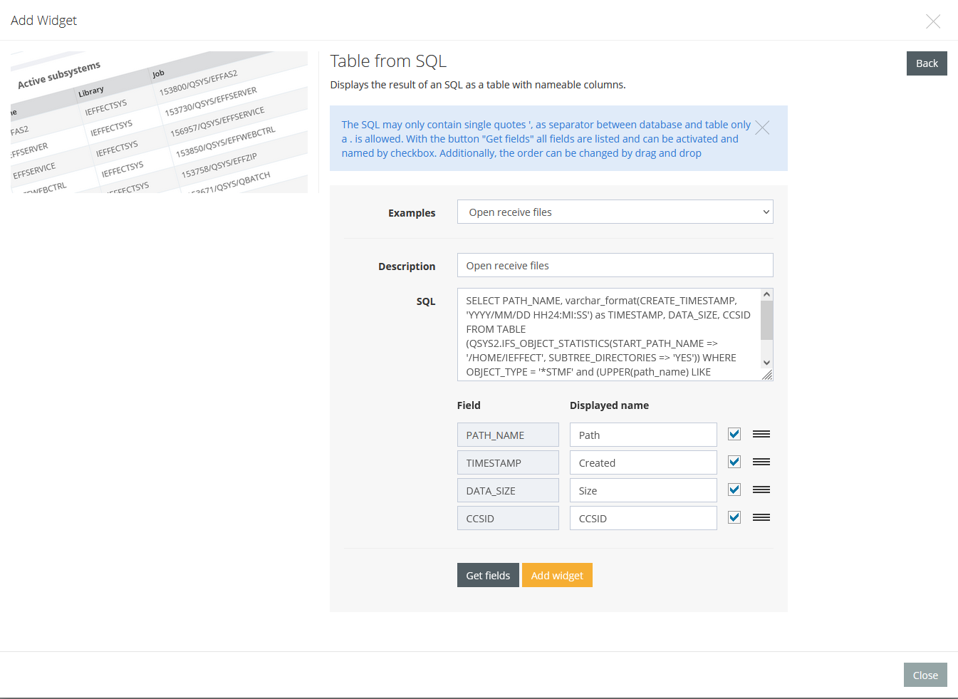The SQL may only contain single quotes ', as separator between database and table only a . is allowed. With the button "Get fields" all fields are listed and can be activated and named by checkbox. Additionally, the order can be changed by drag and drop.