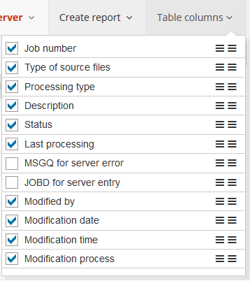 In this window, all available columns are displayed in a list and can be shown or hidden by the checkbox. With the field at the right end of the entries, the columns can be changed in their order by clicking and dragging with the left mouse button. The settings are saved automatically, so that the once defined view is retained even after a logout.