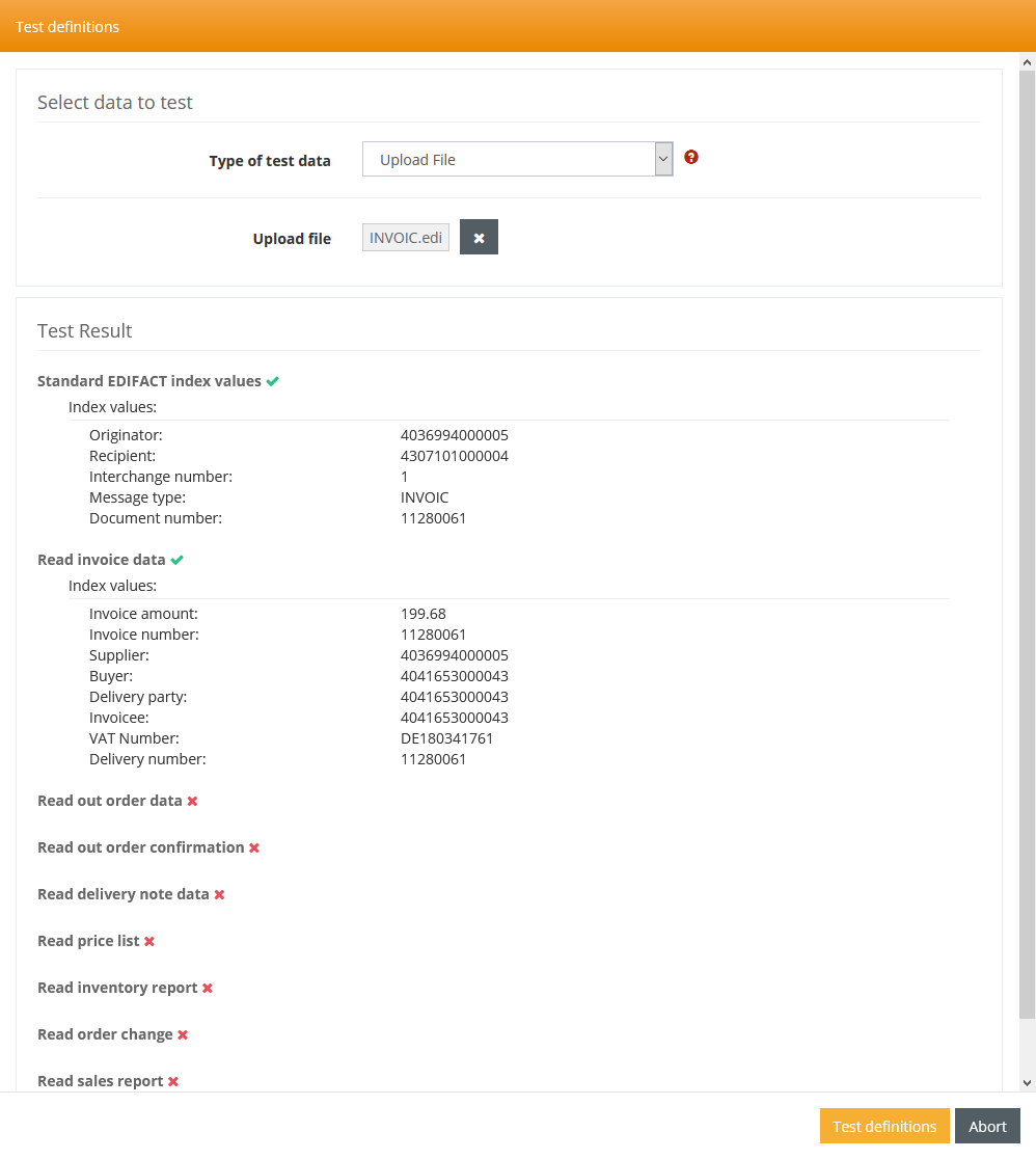 After selecting the test data, the Test button at the bottom of the form is enabled and by clicking on it, the file parser is applied to the test data and the result for each definition is presented.