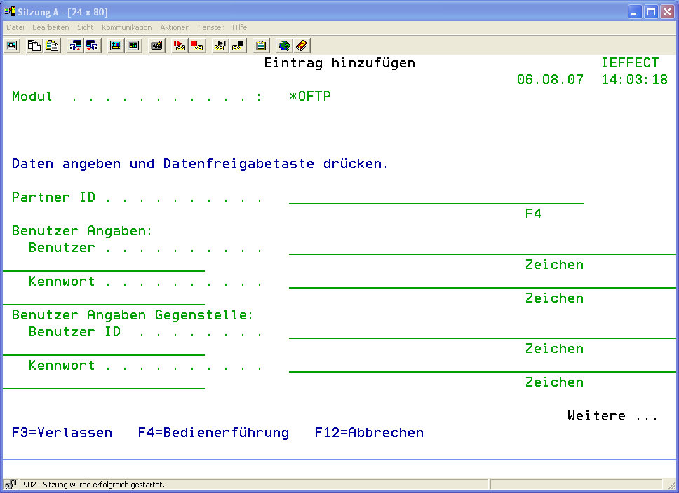 Um Benutzkonten für einen *OFTP Server anzulegen, rufen Sie Menüpunkt „52" auf und gehen mit Auswahl „12" vor das entsprechende OFTP Serverprofil (*RECEIVE). Im darauf folgenden Dialogprogramm haben Sie die Möglichkeit durch drücken von „F6" einen neuen Eintrag anzulegen.