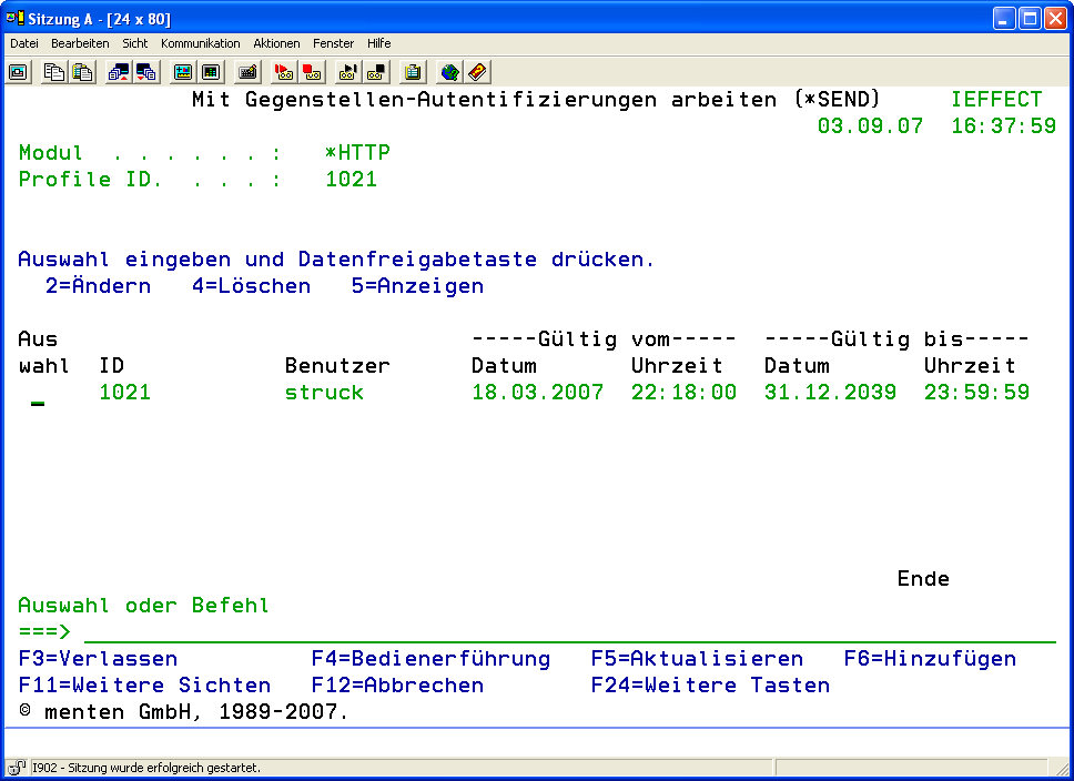 Um Benutzkonten für einen *HTTP Server anzulegen, rufen Sie Menüpunkt „52" auf und gehen mit Auswahl „12" vor das entsprechende HTTP Serverprofil (*RECEIVE). Im darauf folgenden Dialogprogramm drücken Sie bitte „F6".