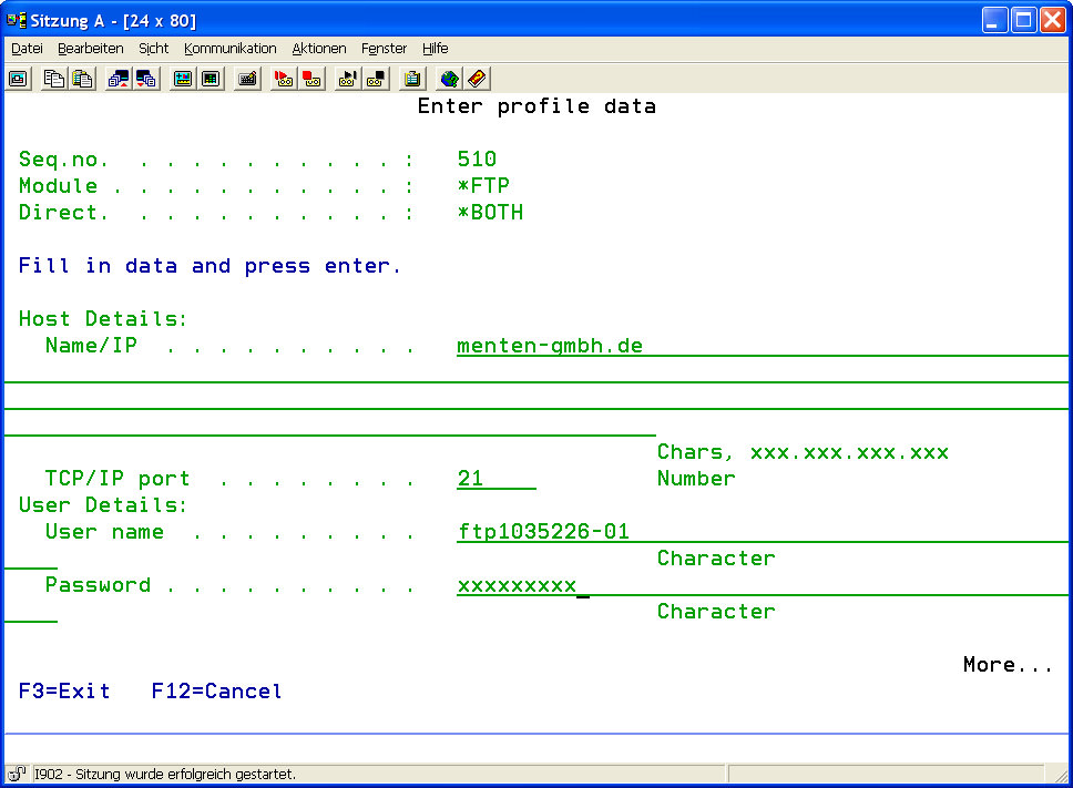 To get to the user management of an FTP oder SFTP server you need to swith to the partner base menue „52" of the i-effect main menueand choose the code number 12 before the server.