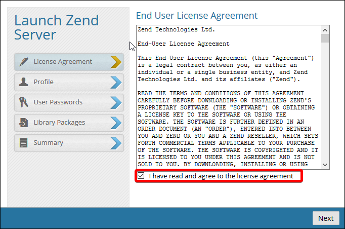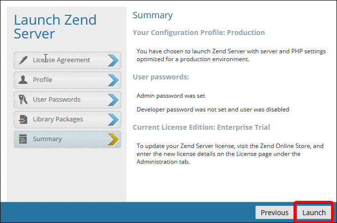 Start the ZendServer by clicking Next and then clicking Launch.