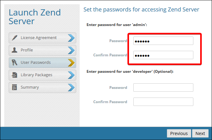 Set a password (for later login to the ZendServer web interface)