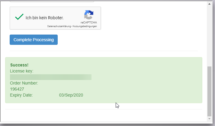 After successful application the license is displayed in the lower part of the form.