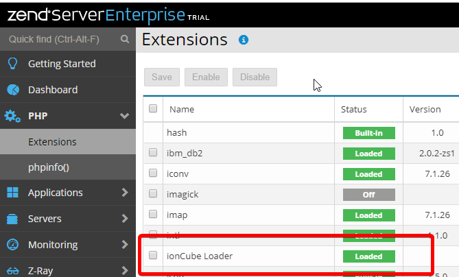 After a successful installation the module ionCube Loader appears in the PHP / Extension menu of the ZendServer (at http://<SERVERNAME>:10081) as "Loaded".